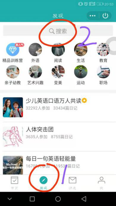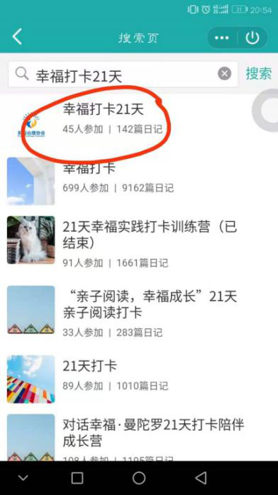 2.点击“发现”栏,进行搜索。在搜索栏中输入“幸福打卡21天”,选择本次活动,点击申请进入圈子参加活动。 )