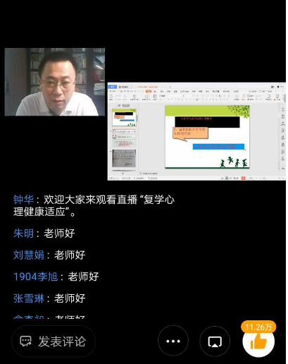 6月2日,我校心理咨询中心钟华教授通过钉钉直播的形式,为我校学生作题为《大学生返校后如何培养健康心态》的线上心理讲座,全校700余名同学参加。