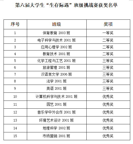 我校第六届大学生“生存际遇”班级挑战赛于2021年5月21日举行,决出团体一等奖1名、二等奖3名、三等奖5名,优秀奖6名,获奖集体颁发证书和奖励。现公告如下: